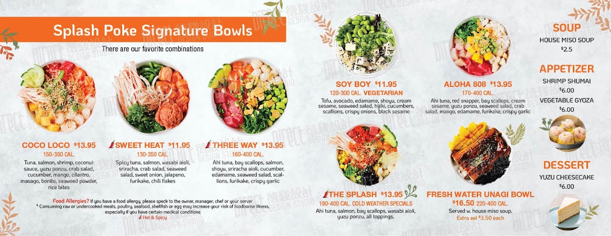 The all-day menu showcases Splash Signature Bowls like the savory DayLee Chicken, featuring authentic Japanese fried chicken nuggets, and the vibrant Aloha 808, which blends ahi tuna, red snapper, and crabmeat with zesty flavors. Each bowl promises to tantalize your taste buds with fresh produce and unique sauces.